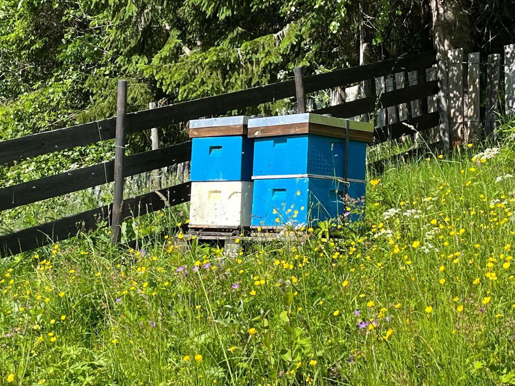 Vi er glade for at biene endelig er på plass for sommeren, med to bikuber på gården vår.